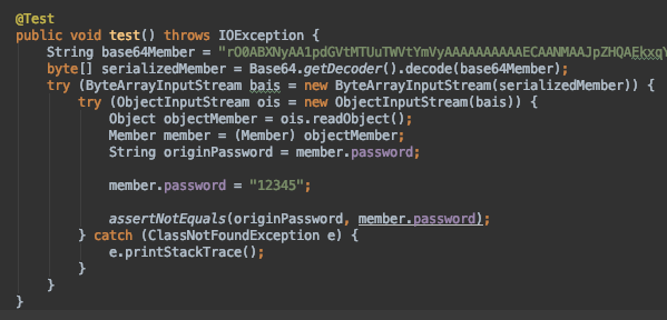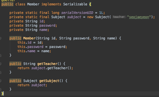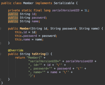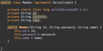 위와 같이 모든 멤버변수가 private 인 Member 클래스를 직렬화한 뒤,
