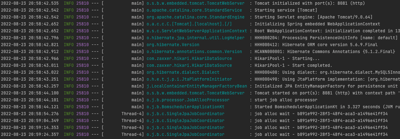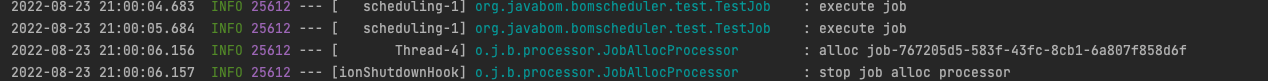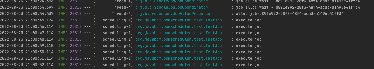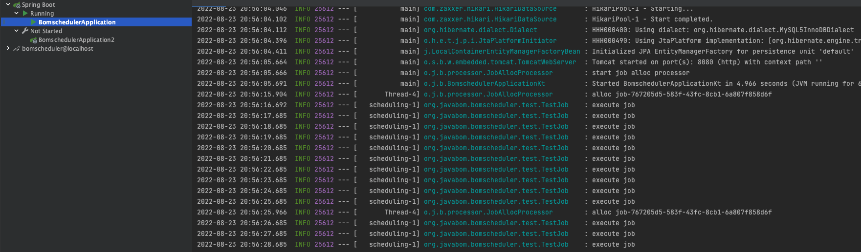 8080포트의 서버를 먼저 실행해서 JobAlloc에 먼저 할당되고 testJob의 스케줄러가 정상적으로 돌아가는걸 확인할 수 있다.