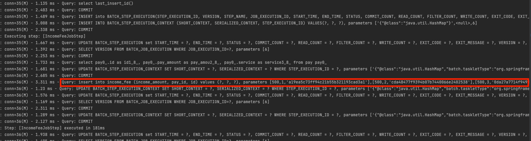 pay(결제)를 incomeFee(입금수수료)를 계산해 저장하는 단순한 배치입니다.