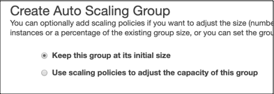 CPU 이용률과 같은 정책을 수립할 수 있는데 수동으로 오토스케일링을 할 것이기 때문에 Keep this group at its initial size 옵션을 지정하겠습니다.