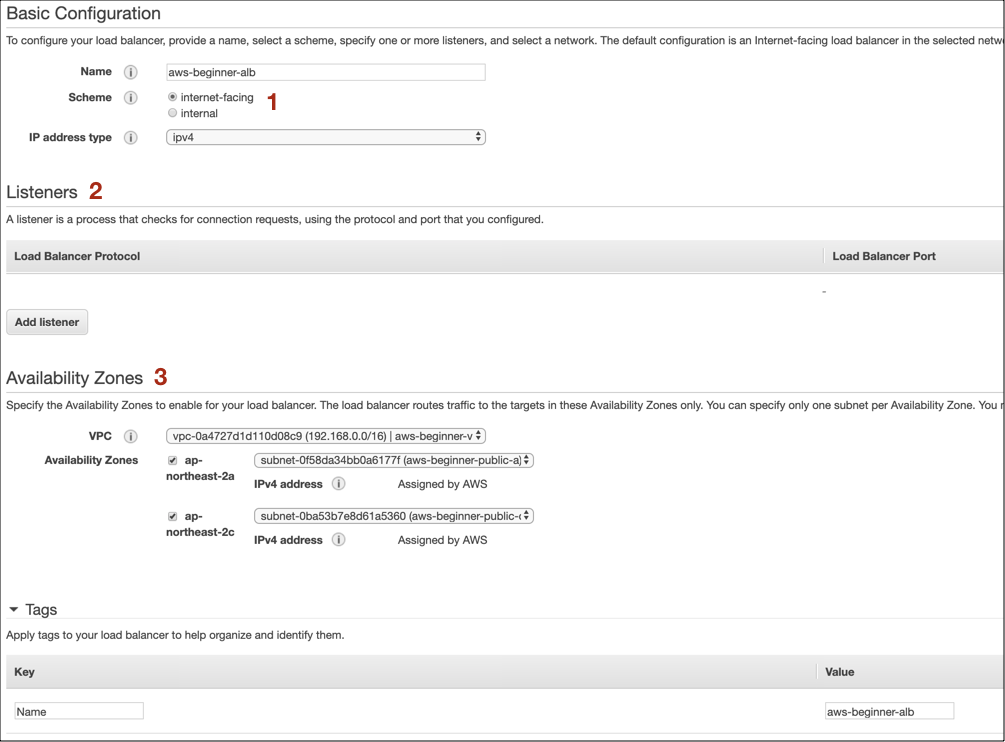 VPC 는 aws-beginner-vpc 로 선택합니다.