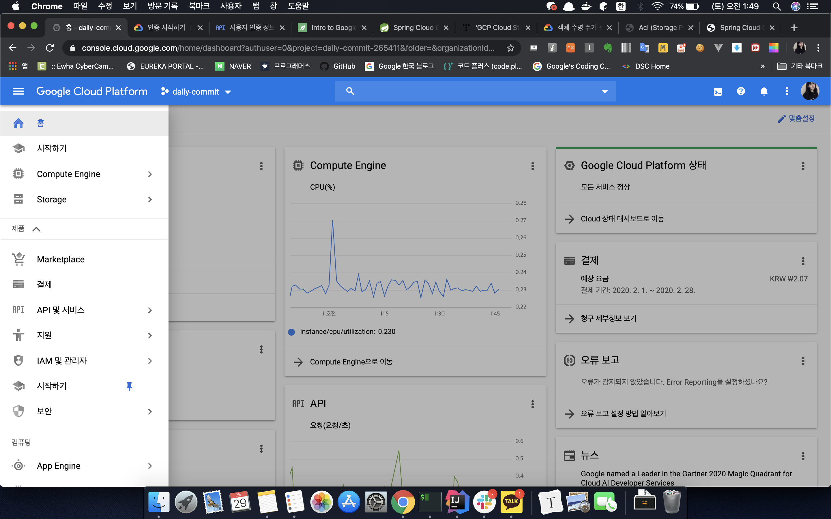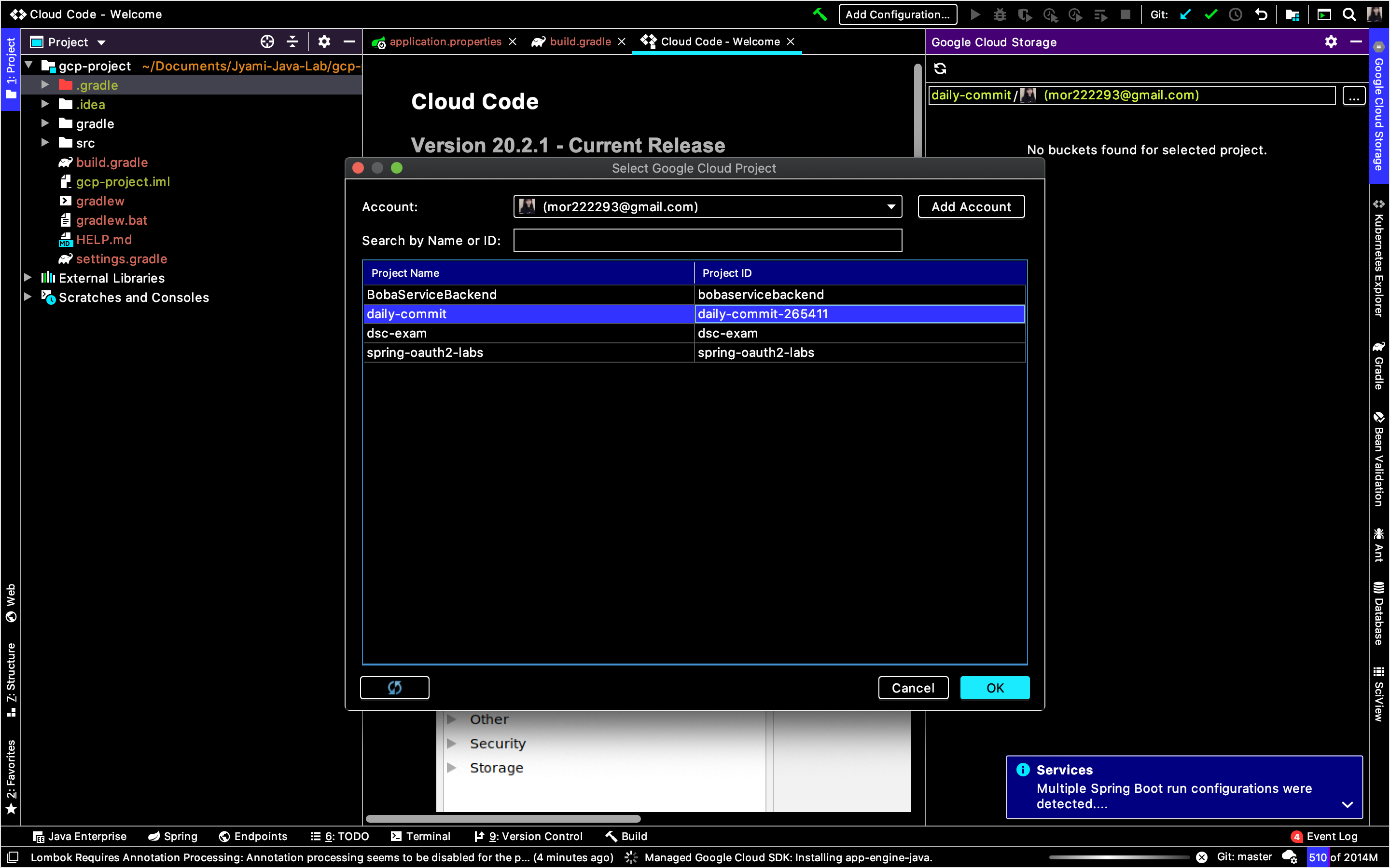 플러그인 설치를 완료하면 인텔리제이 우측 바에 google cloud storage, kubernetes Explorer 탭이 생기며, GCP의 project의 정보를 등록하기 위해 구글 로그인을 진행하여 내 프로젝트의 storage와 연결해준다.
