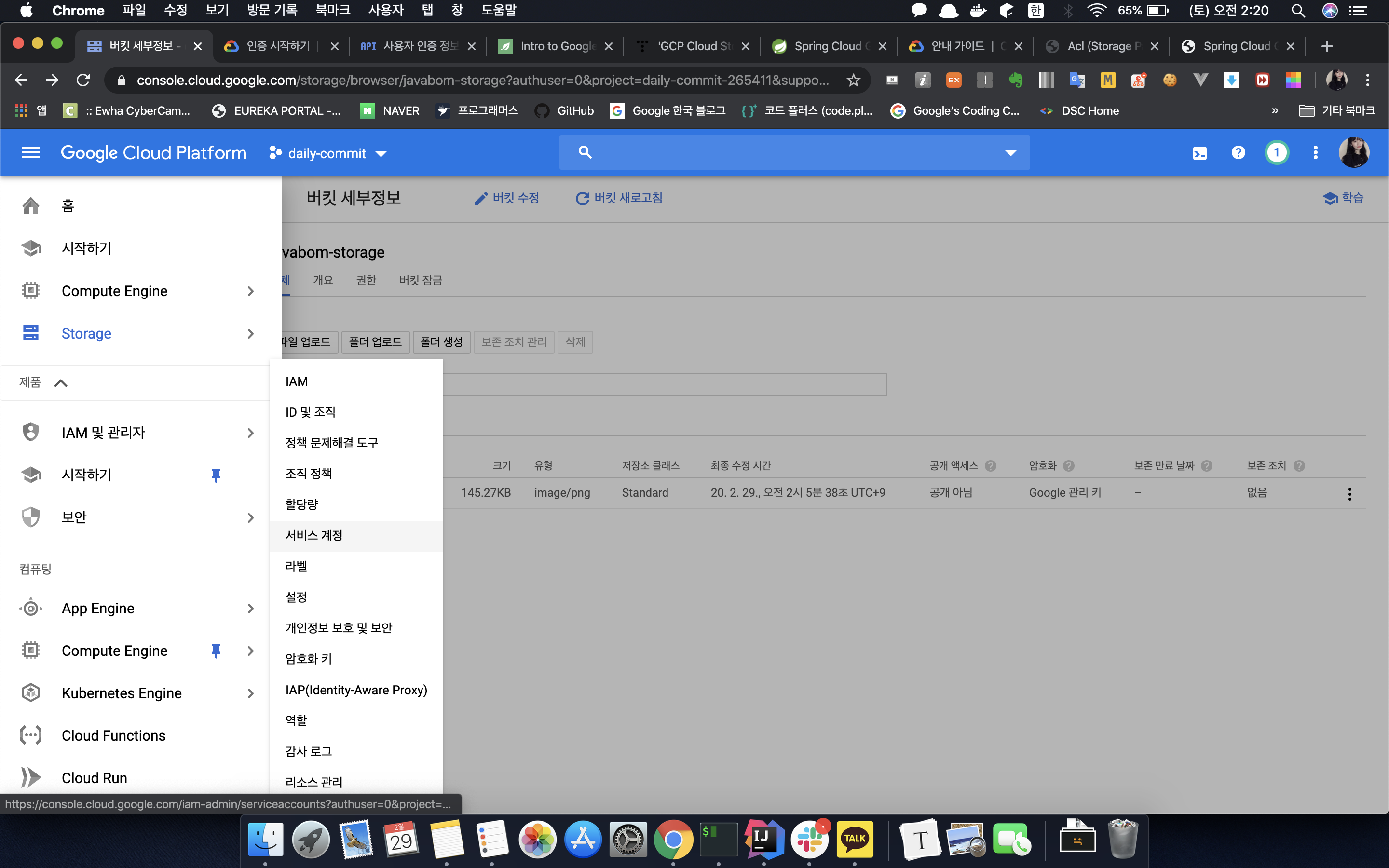 따라서 Springboot에서 내 프로젝트의 Cloud storage에 접근권한을 가질 수 있도록, Access Key를 받아 등록해야한다. 탐색 창을 켜서 IAM 및 관리자 > 서비스 계정 탭으로 들어가 서비스 계정 키를 생성하자.