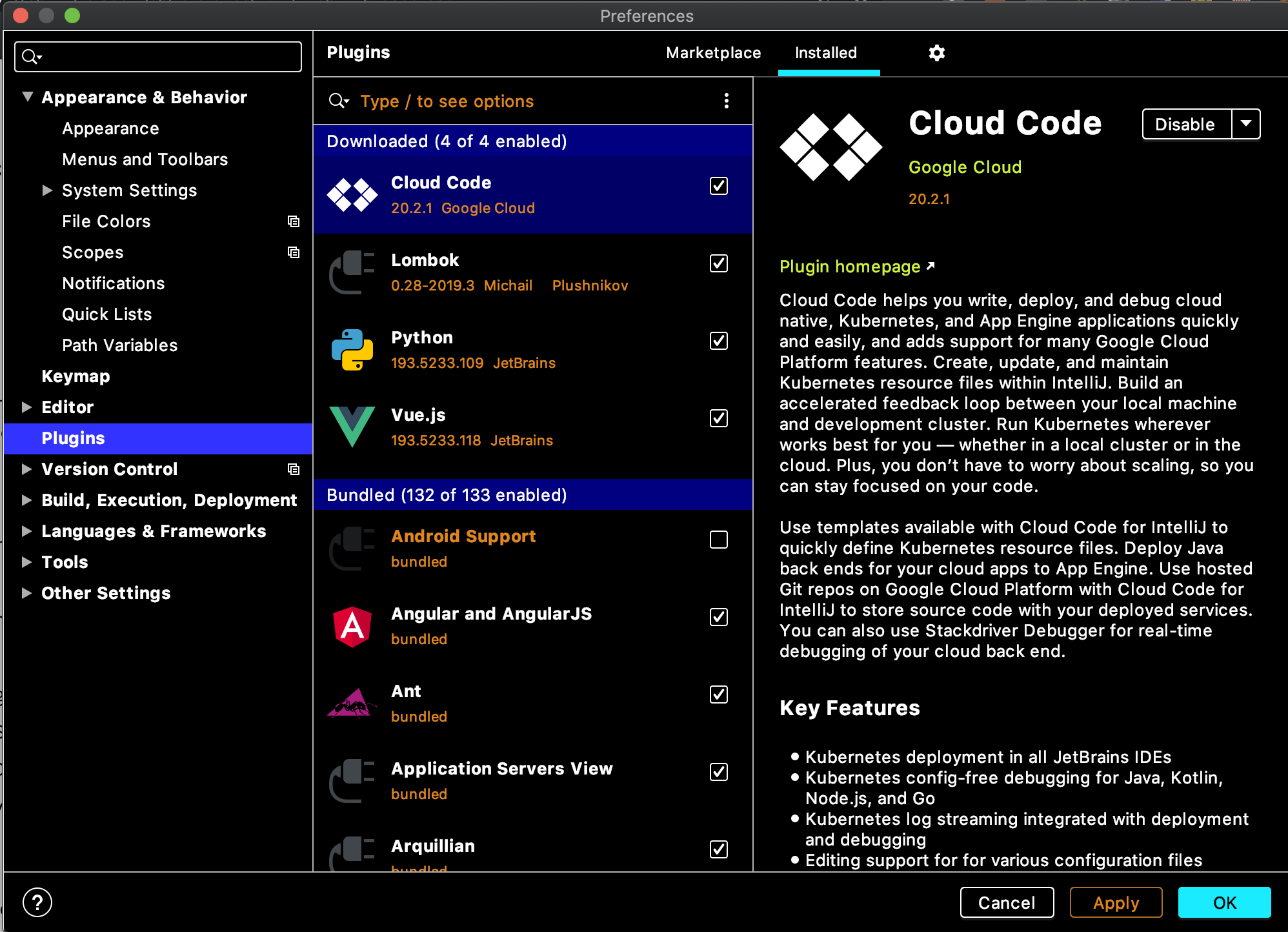 Google에서 개발한 플러그인으로, 설명서를 읽어보니 Intellij가 아니더라도 JetBrains 의 여러 IDE에서 가능했다. 다만 Intellij에 최적화된 플러그인으로, cloud storage 뿐만 아니라 stackdriver, kubernetes 배포 등 google의 프로덕트에 대한 생산성을 증가시킨다.