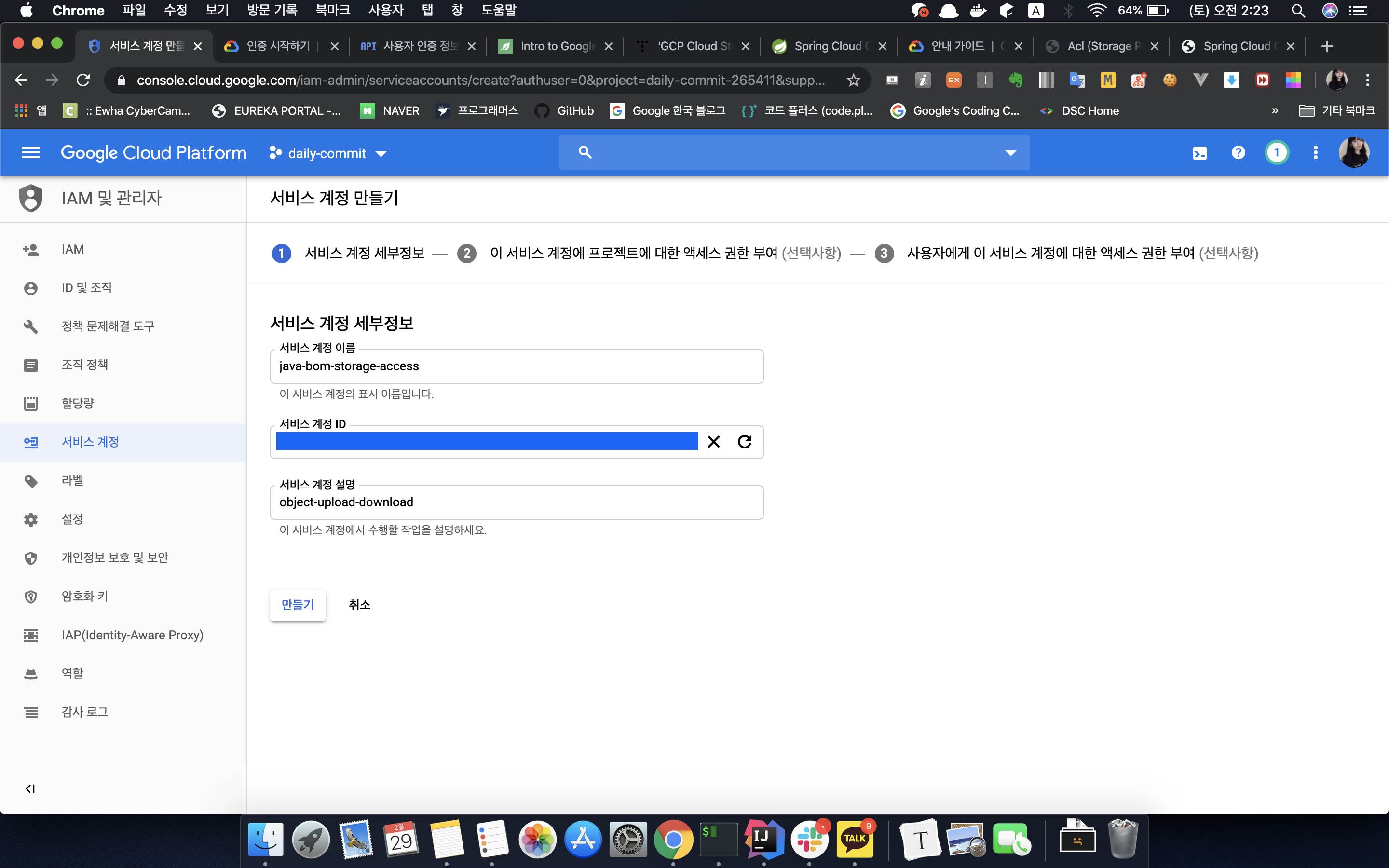 서비스 계정에서 "+ 서비스 계정 만들기" 버튼을 선택하고, 아래와 같이 서비스 계정에 대한 설정을 완료해준다.