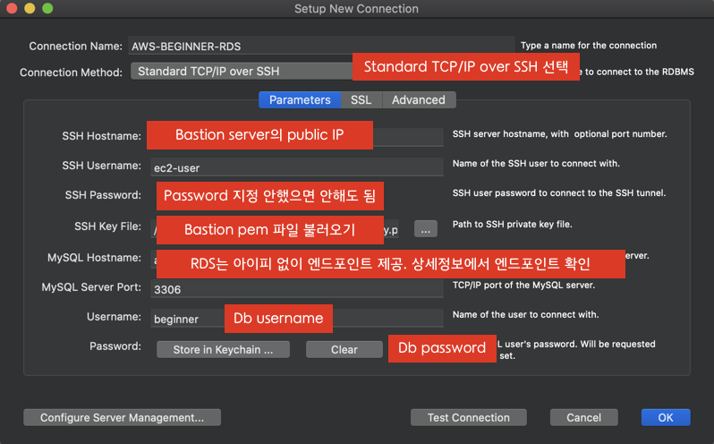 bastion server 와의 SSH 연결을 통해 private 한 DB 인스턴스에 접속하는 것을 짚고 넘어갑니다.
