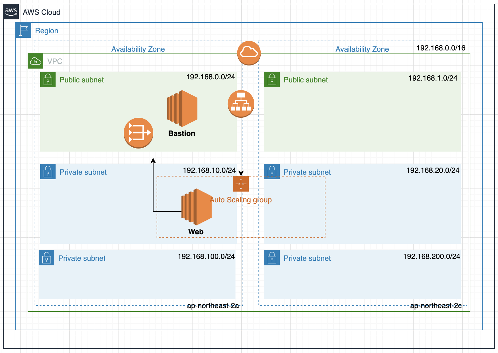 이를 보안그룹에 적용하면, 아래와 같이 bastion 보안그룹, asg 보안그룹을 통해 표현할 수 있습니다.