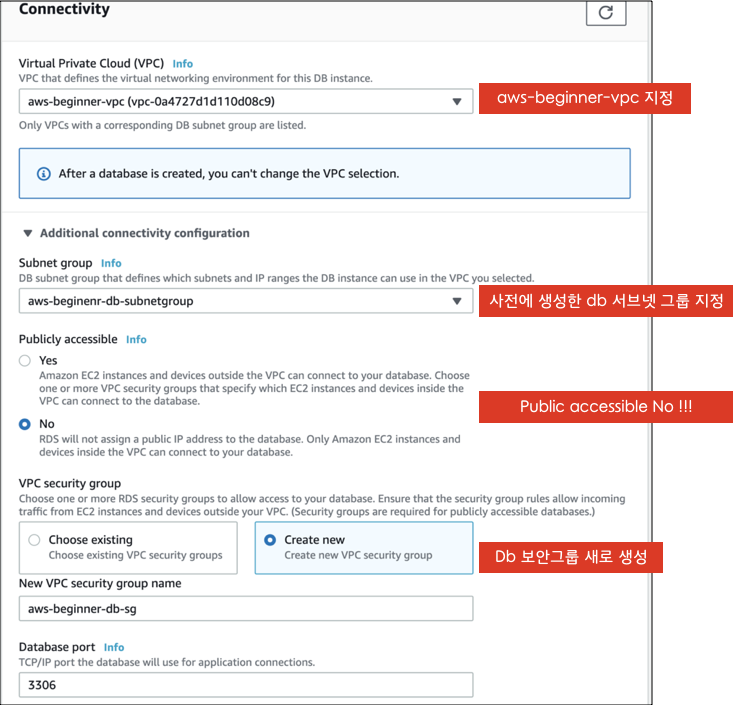 private subnet에 위치하는 db 인스턴스를 보호하기 위해 publicly accessible 옵션을 No 체크한 것에 집중해주세요. 이 DB 인스턴스는 오직 프라이빗 아이피만 가지게됩니다.