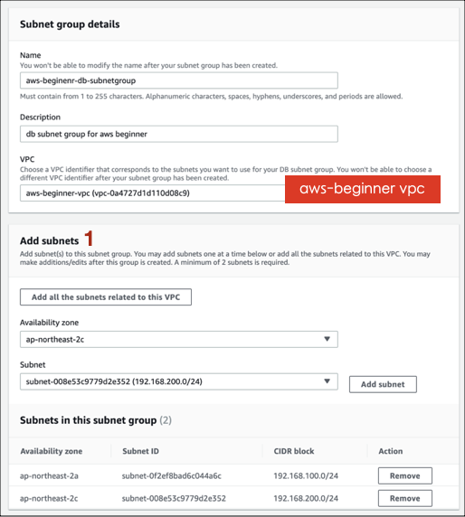 DB Subnet Group에 포함될 서브넷을 지정하는 단계입니다.