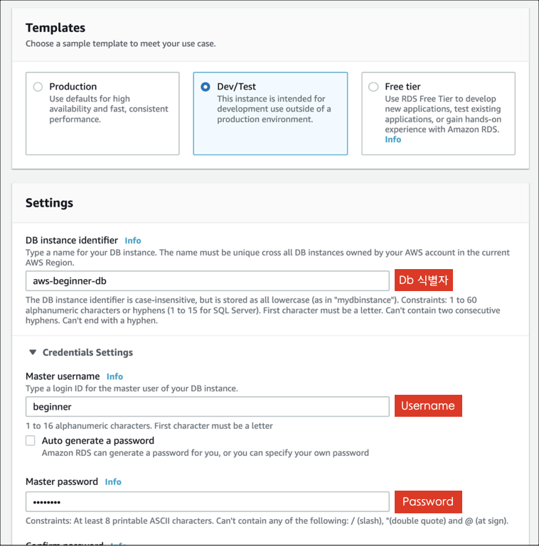 본 포스팅에서는 DB를 Multi-AZ에 배포합니다.(포스팅 상단 아키텍처 참고) 이 옵션을 쓰기 위해서는 Dev/Test 또는 Production 템플릿을 사용해야합니다.