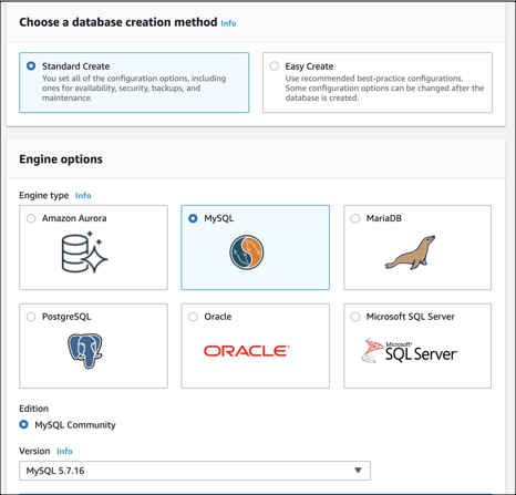 직접 구성을 해주기 위해 Standard Create, Engine 은 MySQL 을 사용합니다.