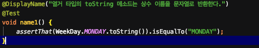 열거 타입의 toString 메소드는 상수 이름을 문자열로 반환한다. 또한 toString 메소드를 재정의하여 사용할 수 있다.