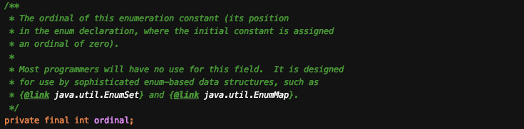 그런데 주의깊게 볼게있다. ordinal 필드의 주석을 보면 '대부분 프로그래머는 이 메소드를 쓸 일이 없다. 이 메소드는 EnumSet과 EnumMap 같이 열거 타입 기반의 범용 자료구조에 쓸 목적으로 설계되었다' 라고 쓰여있다.