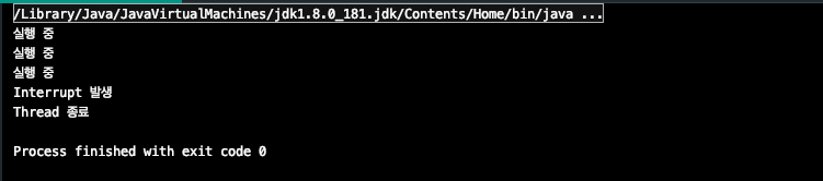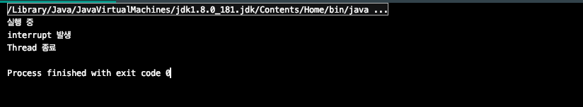 생성한 스레드는 무한히 "실행 중" 이라는 문자열을 출력하는 작업을 수행하는데, 메인 스레드에서 해당 스레드의 interrupt 메소드를 호출하여 반복문을 빠져나와 스레드가 종료되도록 유도하였다.