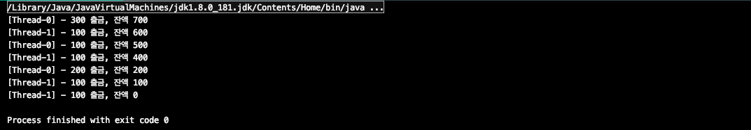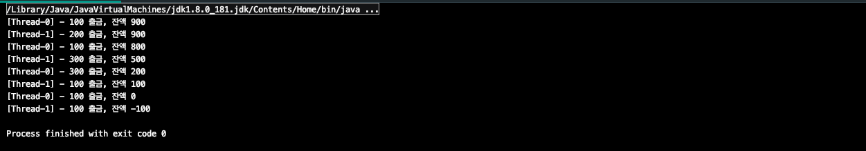 실행 결과와 같이 잔액이 음수값을 가지는 경우가 생겼다. 한 스레드가 변경중인 객체를 다른 스레드가 동시에 변경하였기 때문에 이런 상황이 발생하였다. 이러한 동기화 문제는 synchronized 키워드를 사용하면 해결할 수 있다.