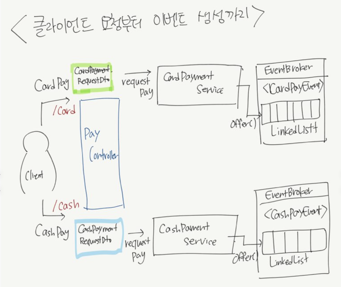 EventBroker는 내부에 이벤트를 순서대로 적재하고 순서대로 꺼내줄 Queue를 가지고 있습니다. PayEvent는 클라이언트로부터 오는 요청을 의미할 것이고, 여기에서는 "현금결제 이벤트", "카드결제 이벤트" 두 종류이기 때문에 PayEvent라는 이벤트로 일반화하고 "한정적 제네릭타입"을 활용하였습니다.