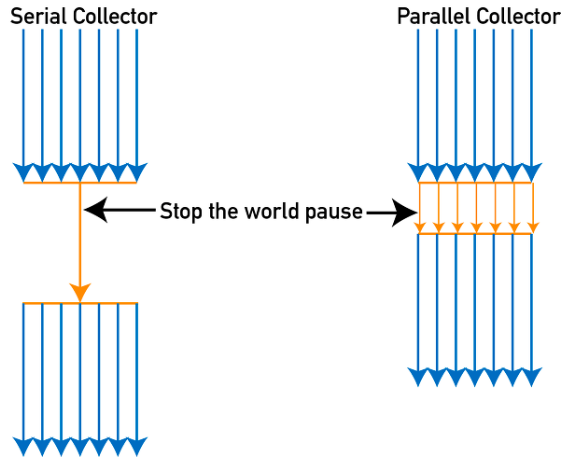 Parallel GC의 GC과정은 Serial GC와 같지만 Serial GC와 달리 Young영역의 GC과정을 멀티 스레드로 수행한다는 점에서 차이가 있다. 따라서 Serial GC에 비해 'Stop The World' 시간이 줄어들었다.