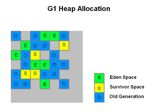 G1 힙에 할당된 모습이다. 각 Region은 Eden, Survivor, Old의 공간으로 할당된다. GC후 살아 남은 객체는 다른 Region으로 이동 또는 복사될 수 있다. 또한 Eden,Survivor, Old 이외로 Homongous라는 영역이 존재하는데 이는 객체의 크기가 Region의 50% 보다 큰 경우를 위한 영역이다.