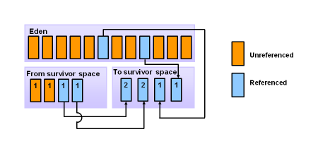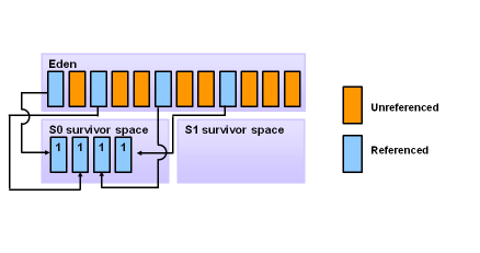 Young generation : 새로운 객체들이 이 영역에 할당된다. Eden과 2개의 Survival 영역으로 나누어 지며 Young 영역에서 일어나는 GC 를 'Minor GC'라 한다.