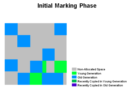 Initial Mark 단계에선 Survivor 영역에서 Old 영역을 참조하고 있을 수 있는 영역들을 마킹한다. Survivor 영역을 마킹하는 단계이기 때문에 Young GC에 의존적(PiggyBacked)이기 때문에 Stop The World를 발생시킨다.