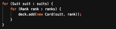 여기서 문제점은 무엇일까? 카드 문양의 반복자 i가 문양 하나당 호출되어야 하는데 중첩 for문의 제일 안쪽에서 숫자 하나당 호출 되고 있기때문에 Suit의 모든 원소를 순회하고 나면 NoSuchElementException을 던질 것이다.