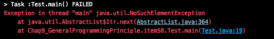 그런데 이 규칙의 예외로 초기화에 검사 예외를 던질 가능성이 있는 경우는 try블록 안에서 초기화해야한다. 만약 변수를 try블록이 끝난 뒤에도 사용해야 한다면 선언은 try블록 바로 앞에서 선언하도록 하자.