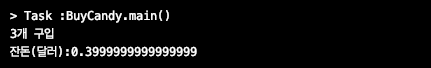 예를들어 나한테 1달러가 있고 선반에는 사탕이 10센트, 20센트, 30센트, .... 1달러 까지 있다고 가정해보자. 10센트 부터 순서대로 하나씩 살 수 있을 때까지 사고 사탕을 몇 개 살 수 있고 남은 잔돈을 얼마일까? double을 이용해서 코드로 구현해보자.