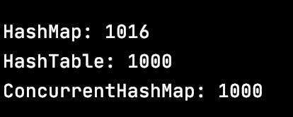 HashTable과 ConcurrentHashMap 은 put 메서드에 대해 동시성을 지원한다. 따라서 실행자가 1000번의 동시수행을 시도해도 key 값이 1-1000으로 고정되어있기 때문에 항상 size는 1000 임을 보장한다.